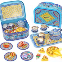 15개 세트 어린이 틴 티 세트 역할 놀이 티 커피 파티 세트 디저트 액세서리 및 휴대용 케이스 포함 어린이를 위한 완벽한 선물